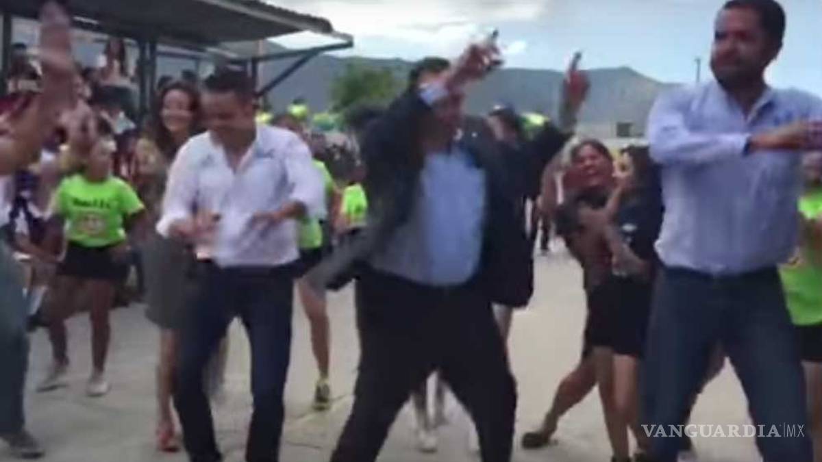 Ahí el grupo de baile de esta secundaria comenzó su presentación con una coreografía, fue en la segunda melodía en la que el alcalde se levantó para seguir la coreografía que las estudiantes ya tenían preparada.