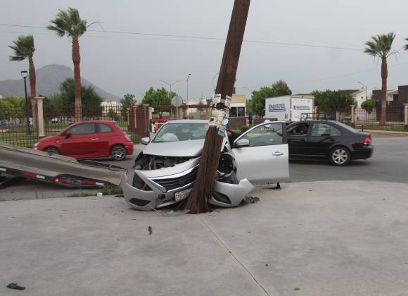 Una joven resultó lesionada tras impactar su vehículo contra un poste de telefonía al salir de un fraccionamiento donde reside, sin lograr completar la vuelta de manera adecuada.