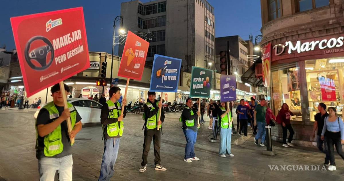 Durante la intervención, las y los jóvenes mostraron letreros gigantes con mensajes preventivos como: “Manejar borracho es la peor decisión”, “Tu vida no es un juego”, “Si tomaste entrega las llaves, no tu vida”, “Después de la fiesta el riesgo no acaba” y “Manejar borracho no es mala suerte, es mala elección”, entre otros llamados a la responsabilidad al volante.