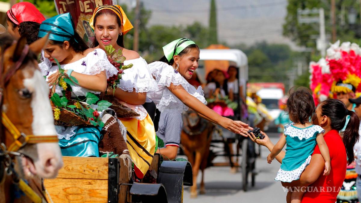 A las afueras del recinto, ya se sentía el orgullo parrense en su gente que esperó al desfile durante una hora sobre los bordes de la carretera por la que entras al pueblo. La reina de Parras, Mara, de 19 años, entusiasmada abordó una enorme carretilla repleta de racimos de parral y hojas de viñedo que jalaban dos viejos y grandes bueyes, como en las imágenes de la mitología romana.