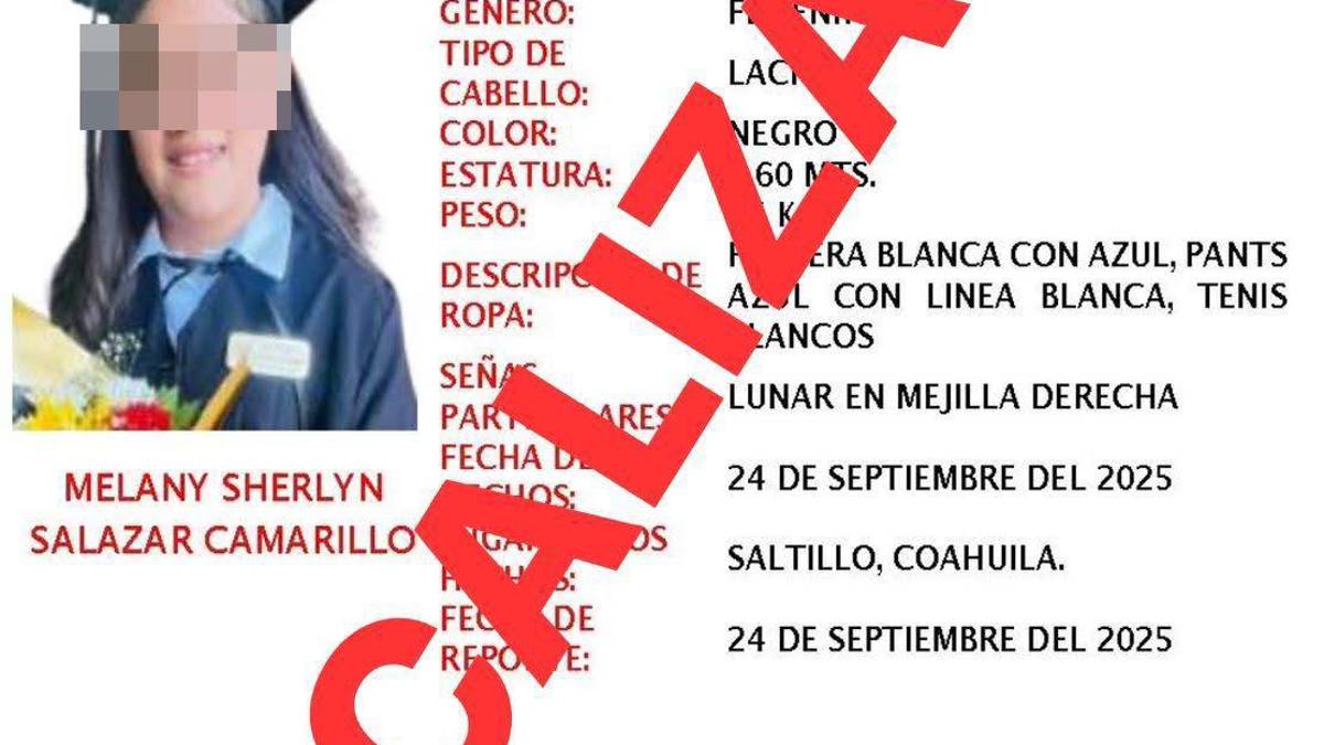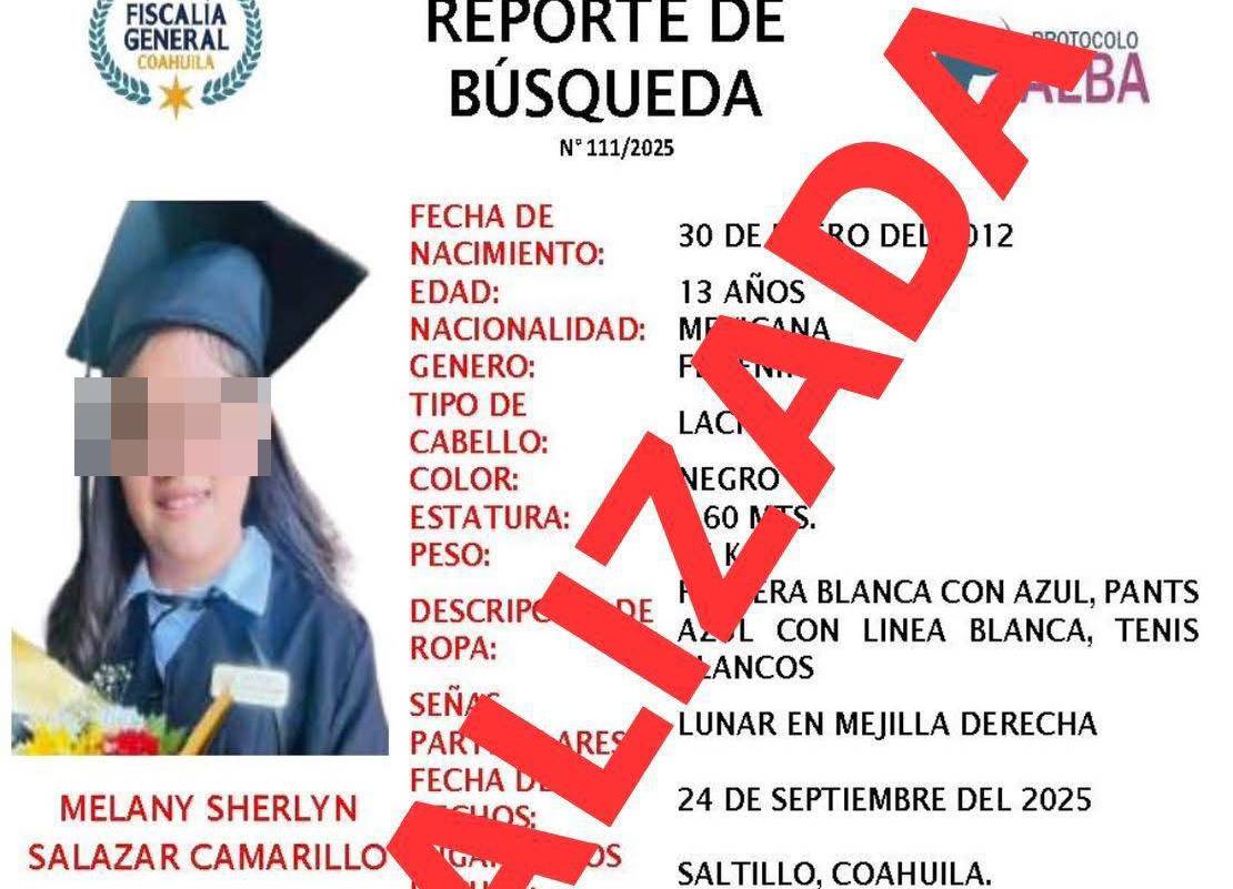 De acuerdo con la Fiscalía General del Estado de Coahuila, elementos de la Agencia de Investigación Criminal ubicaron a la adolescente en inmediaciones de la Alameda Zaragoza, confirmando que se encontraba en buen estado de salud. La dependencia informó que, en tanto continúan las investigaciones, Melany fue reintegrada a su familia.