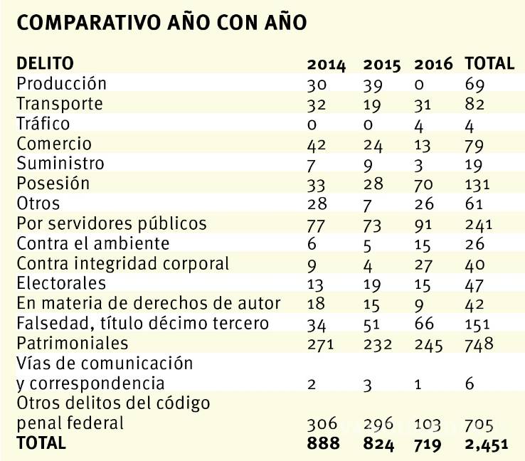 En total el Secretariado Ejecutivo del Sistema Nacional de Seguridad Pública ha contabilizado 2 mil 451 delitos federales de 2014 al 2016.