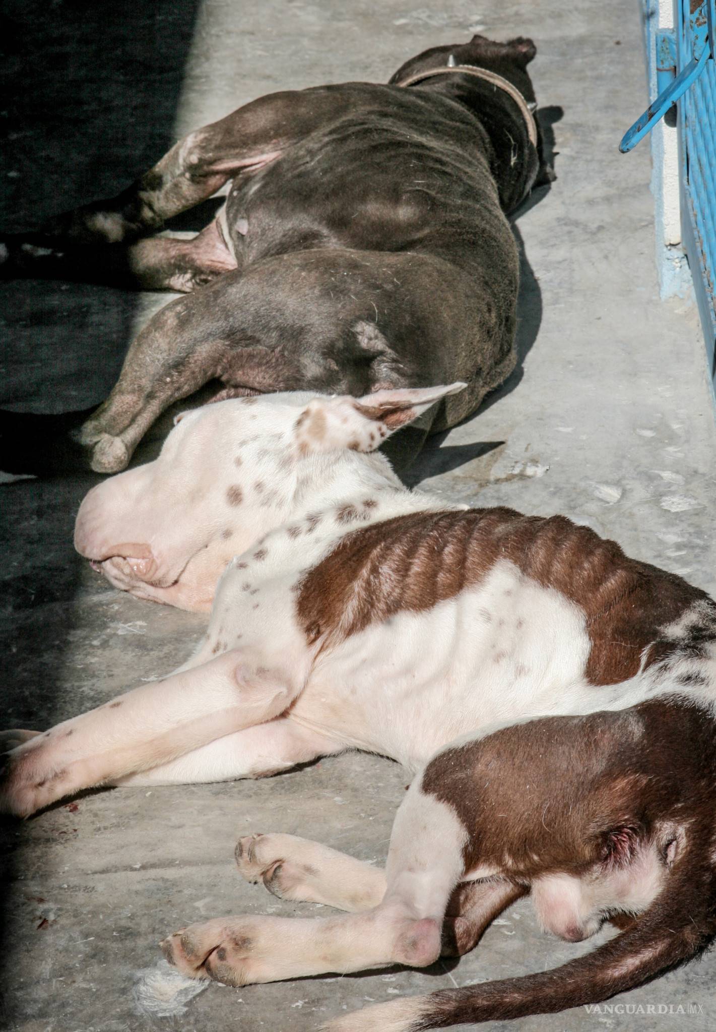 Sobre el suelo de cemento hay tirados varios perros de distintos colores y tamaños, un criollo acá, otro criollo allá, un pitbull acá, otro pitbull allá.