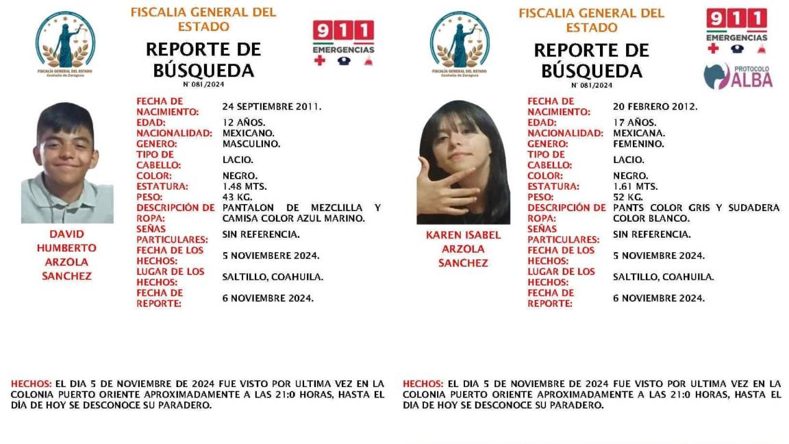 La Fiscalía de Coahuila emitió una alerta para localizar a David Humberto y Karen Isabel Arzola Sánchez, desaparecidos desde el pasado 5 de noviembre