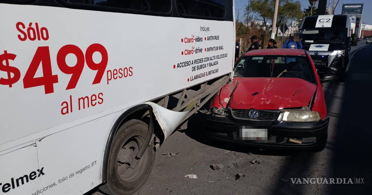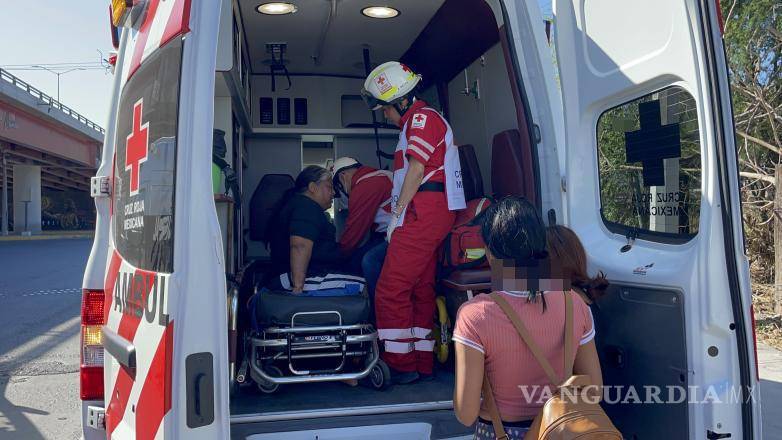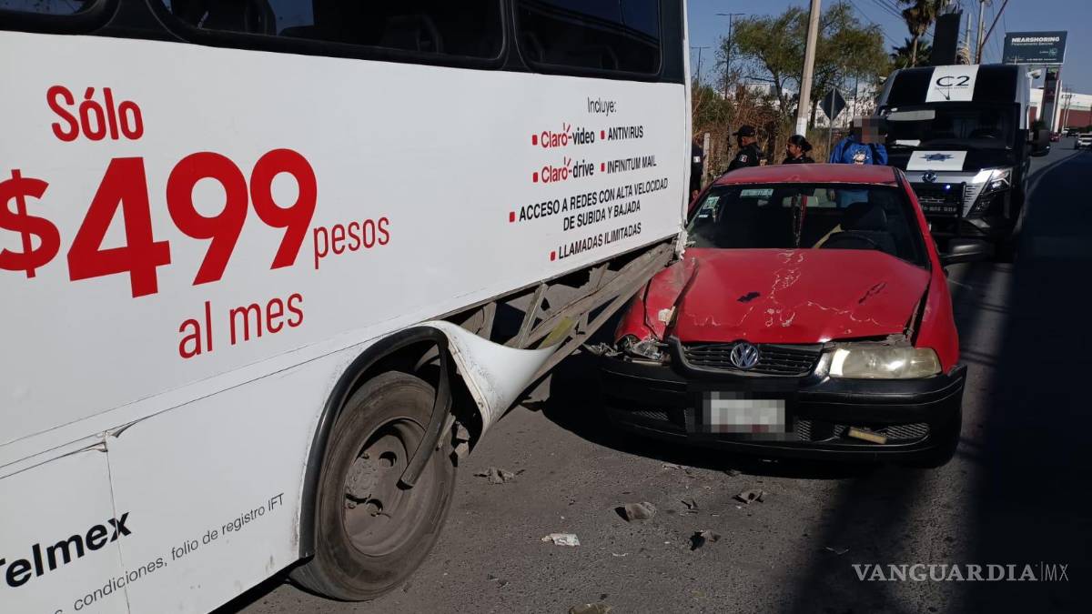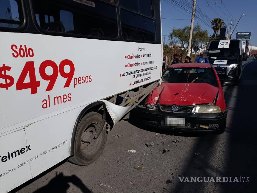 La esposa de un automovilista fue valorada por personal paramédico de la Cruz Roja la mañana de este sábado, luego de que su vehículo se impactara contra la parte trasera de una unidad de transporte urbano sobre la lateral del bulevar Nazario Ortiz Garza, en Saltillo.