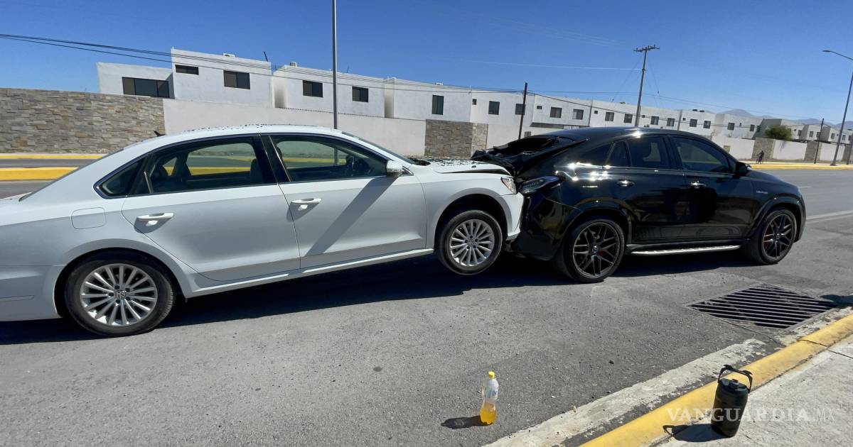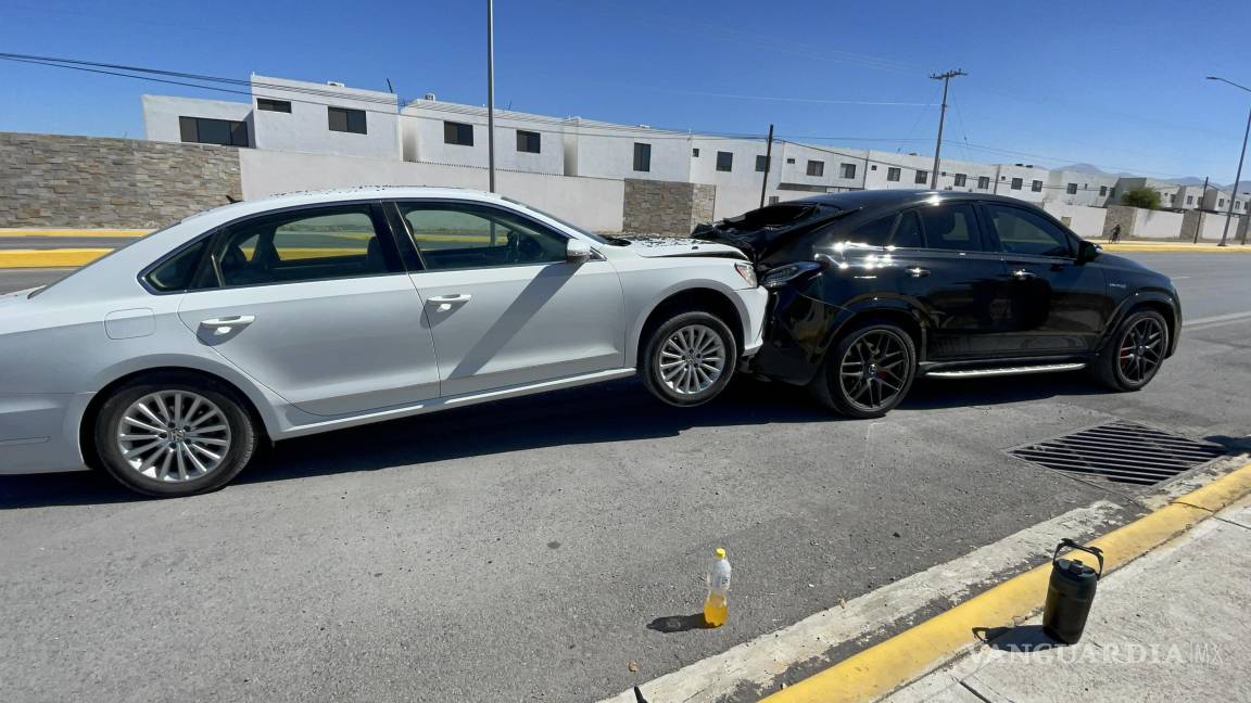 Tras no frenar a tiempo en un bordo, la conductora de un automóvil Volkswagen Jetta terminó por montarse detrás de una camioneta Mercedes-Benz la mañana de este viernes, en Saltillo.