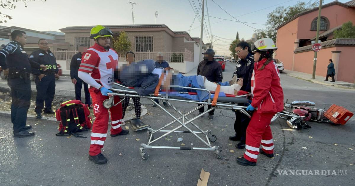 Con una probable fractura en la pierna derecha terminó un motociclista que fue trasladado a la Clínica Dos del IMSS en Saltillo, luego de resultar afectado en un accidente vial ocurrido la mañana de este lunes.