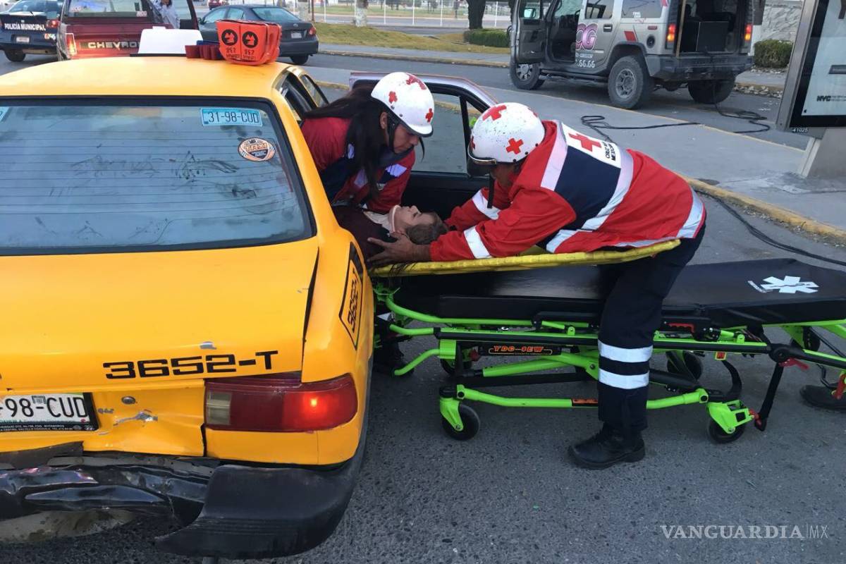 Entre una camioneta y un vehículo compacto hicieron acordeón un taxi, lo cual arrojó como saldo dos personas lesionadas, que fueron llevadas a un hospital por paramédicos de la Cruz Roja.