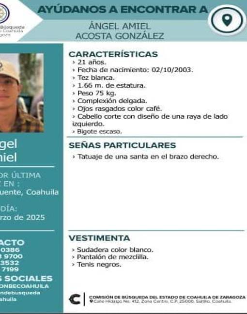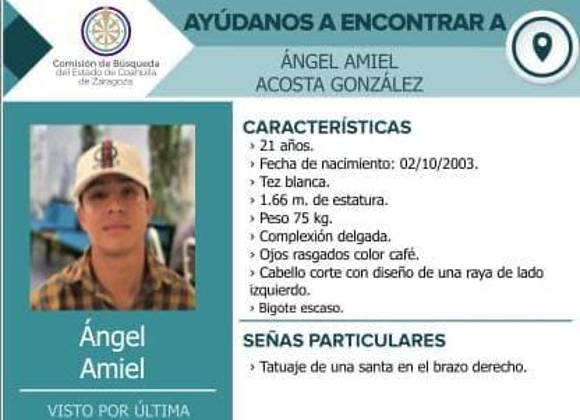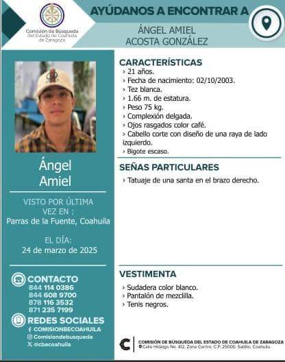 La Fiscalía General del Estado de Coahuila y las autoridades locales solicitan la colaboración de la ciudadanía para localizar a Ángel Amiel Acosta González, quien fue reportado como desaparecido en el municipio de Parras de la Fuente.