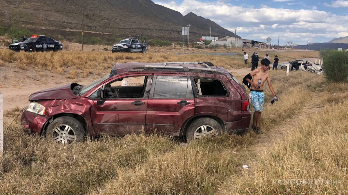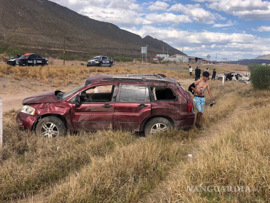 Dos familias por poco pierden la vida al verse involucrados en un aparatoso choque y volcadura que se registró en el kilómetro 34 de la carretera libre Torreón-Saltillo.
