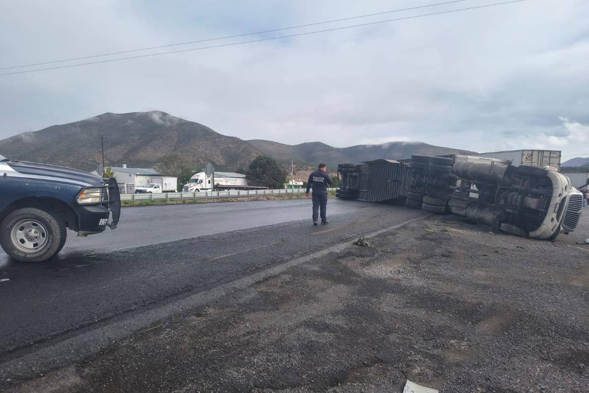 Un tractocamión que circulaba a exceso de velocidad terminó volcado la mañana de este sábado sobre la carretera federal 57, a la altura del ejido Los Llanos, lo que provocó afectaciones en la circulación con dirección a Saltillo.