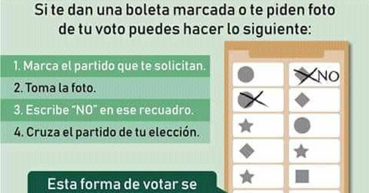 Dentro de la imagen, se explica que en caso de que alguna persona esté siendo obligada a votar por un candidato en específico y a presentar pruebas de ello, puede recurrir a este recurso, cruzando el candidato por el cuál le están obligando a votar en primer paso, tomar la foto en seguida y escribir “NO” o “ESTE NO” en ese recuadro; y por último sufragar con el candidato o partido de su verdadera intención.