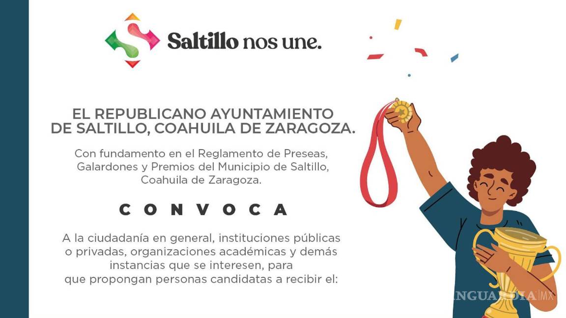 El Ayuntamiento de Saltillo ha establecido las bases de la convocatoria y la fecha límite para la entrega de propuestas, detallando que las instituciones o ciudadanos interesados deberán presentar la documentación correspondiente para avalar la candidatura del nominado.