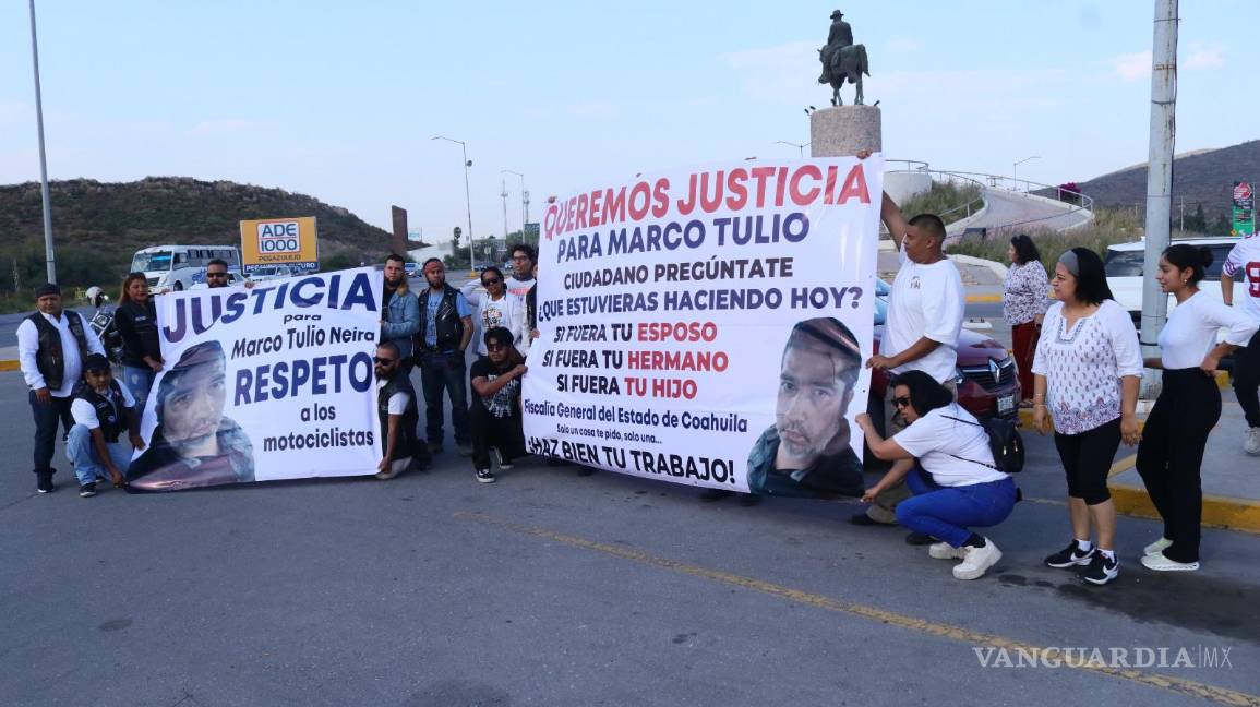 “Justicia para Marco Tulio Neira. Respeto a los motociclistas” y “Queremos justicia para Marco Tulio. Ciudadano pregúntate, ¿qué estuvieras haciendo hoy? Si fuera tu esposo, si fuera tu hermano, si fuera tu hijo. Fiscalía General del Estado de Coahuila, solo una cosa te pido, solo una... ¡HAZ BIEN TU TRABAJO!”, se leyó en las lonas que desplegaron los manifestantes.