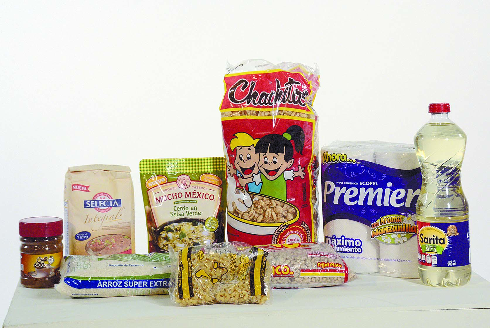 Un aceite “Sarita” de 900 mililitros; un kilo de harina integral “Selecta”, un sobre de 350 gramos de cerdo en salsa verde, guiso de soya, “Mucho México”; un paquete con cuatro rollos de papel higiénico “Premier”, frijol pinto “Paco” de un kilo; 900 gramos de arroz “Kosland”, un paquete de 200 gramos de pasta “La Aurora”, un frasco de 50 gramos de “Café 6:00 a.m.”, con azúcar y una bolsa de 250 gramos de cereal de trigo inflado y endulzado “Chachitos”.