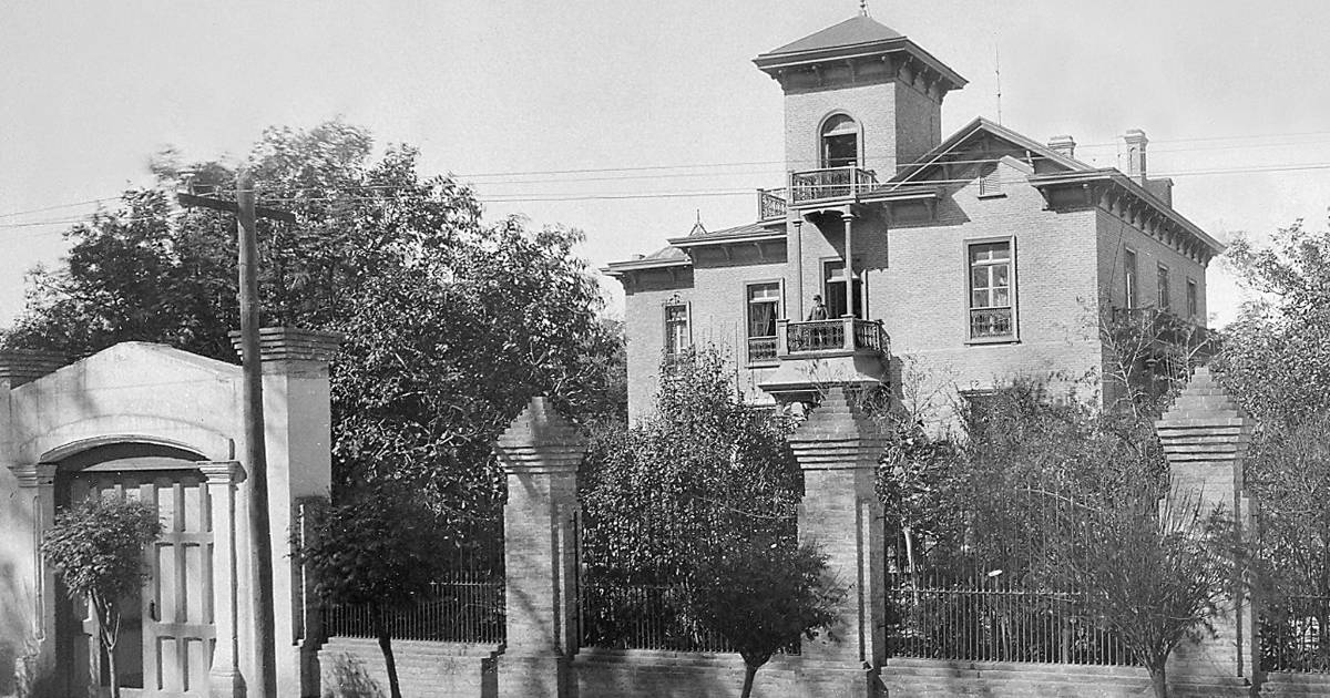 Posa para la fotografía el propietario desde el balcón central de la mansión, la casa perteneció a Enrique Maas, singular personaje que llegó a Saltillo en 1870, proveniente del pueblo de Soest, Westfalia, territorio de la antigua Prusia.