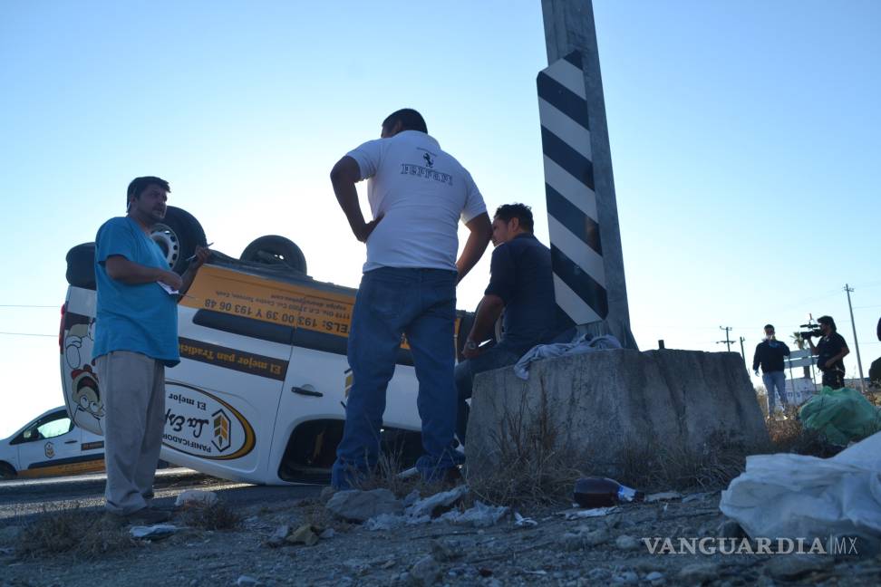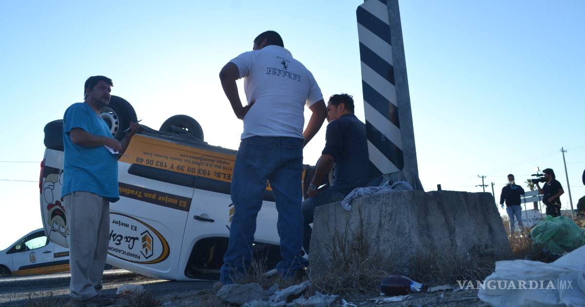RAMOS ARIZPE, COAH.- Sobre su toldo terminó la camioneta de la Panadería y Tortillería Las Espigas, a la altura del kilómetro 13+100 de la carretera antigua a Monclova, antes del cruce con la carretera Los Pinos.