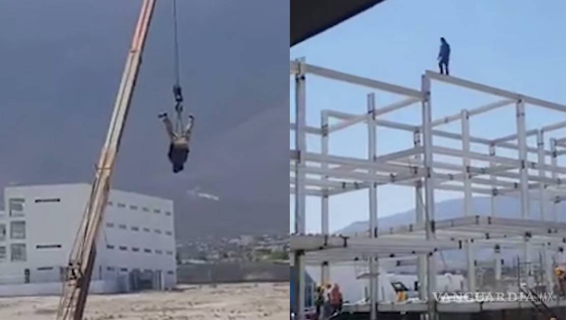 En los primeros segundos del video se observa cómo un hombre se columpia colgado del gancho de una grúa