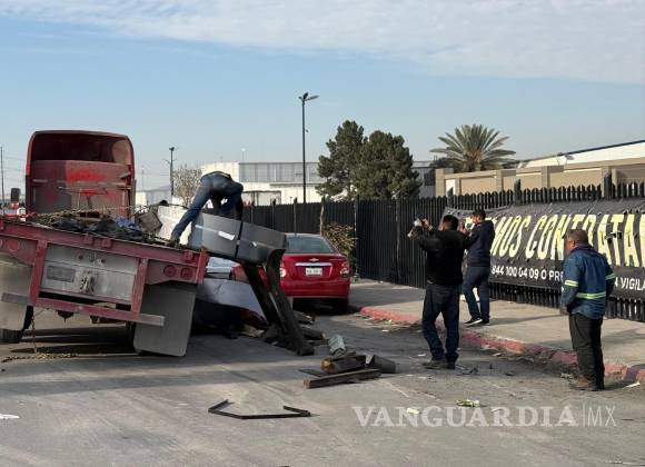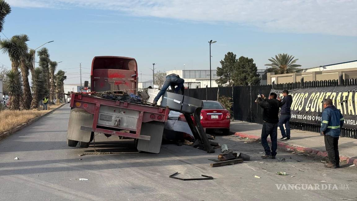 Rollos de acero caen de tráiler y aplastan a dos vehículos, en Ramos Arizpe