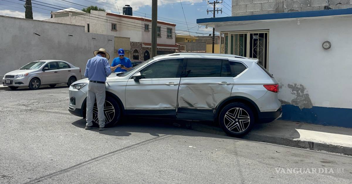 Saltillo: camioneta termina sobre la banqueta tras choque entre dos vehículos