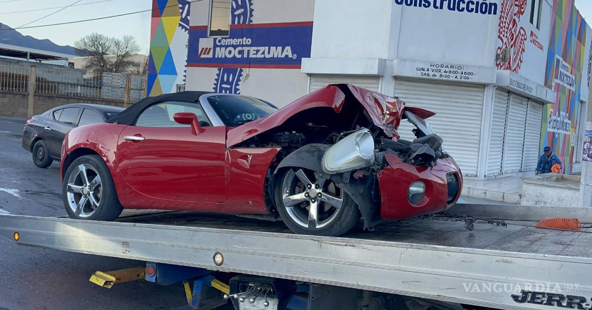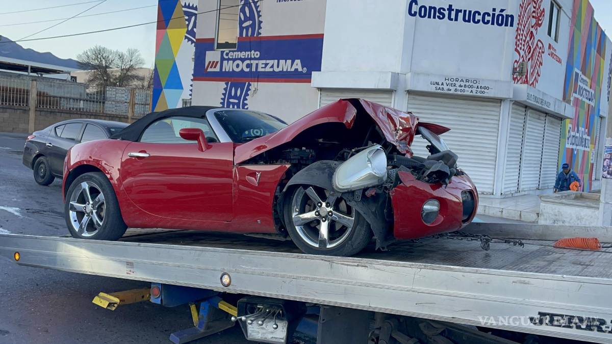 Un automóvil Pontiac Solstice quedó destrozado tras chocar contra una camioneta Ford F-150 en la avenida Central, antes del cruce con Fundadores, en la colonia Vista Hermosa de Saltillo. El accidente ocurrió cuando el conductor del vehículo deportivo, que circulaba a exceso de velocidad, no logró frenar a tiempo al cambiar el semáforo de luz verde a amarilla.