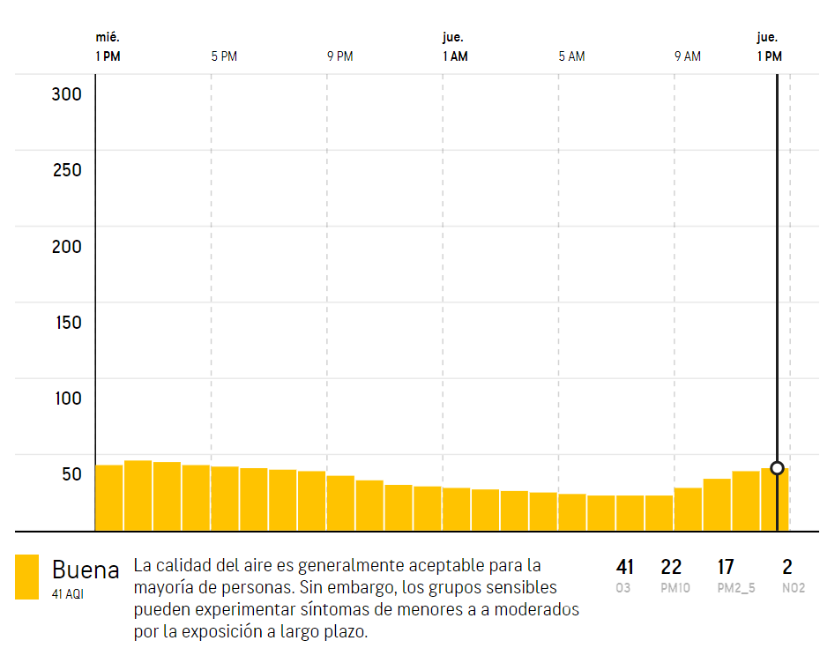 De acuerdo con la actualización de ese sitio web a las 13:23 horas de la tarde de este 18 de mayo se tiene una calidad del aire regular, aceptable, aunque indica que puede existir un riesgo de salud moderado con algunos contaminantes para una cantidad reducida de personas sensibles a la contaminación del aire.