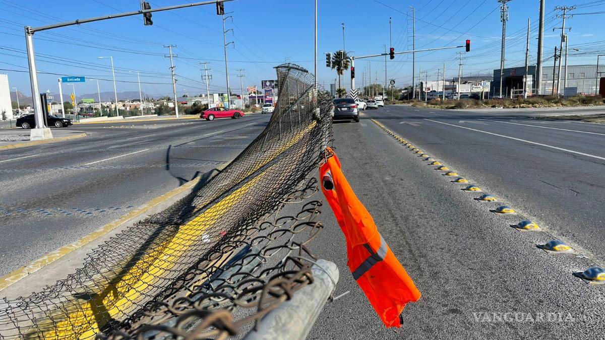 En el camellón entre Plaza Sendero y la Facultad de Ciencias de la Comunicación de la Universidad Autónoma de Coahuila, la reja metálica comenzó a vencerse desde hace semanas.
