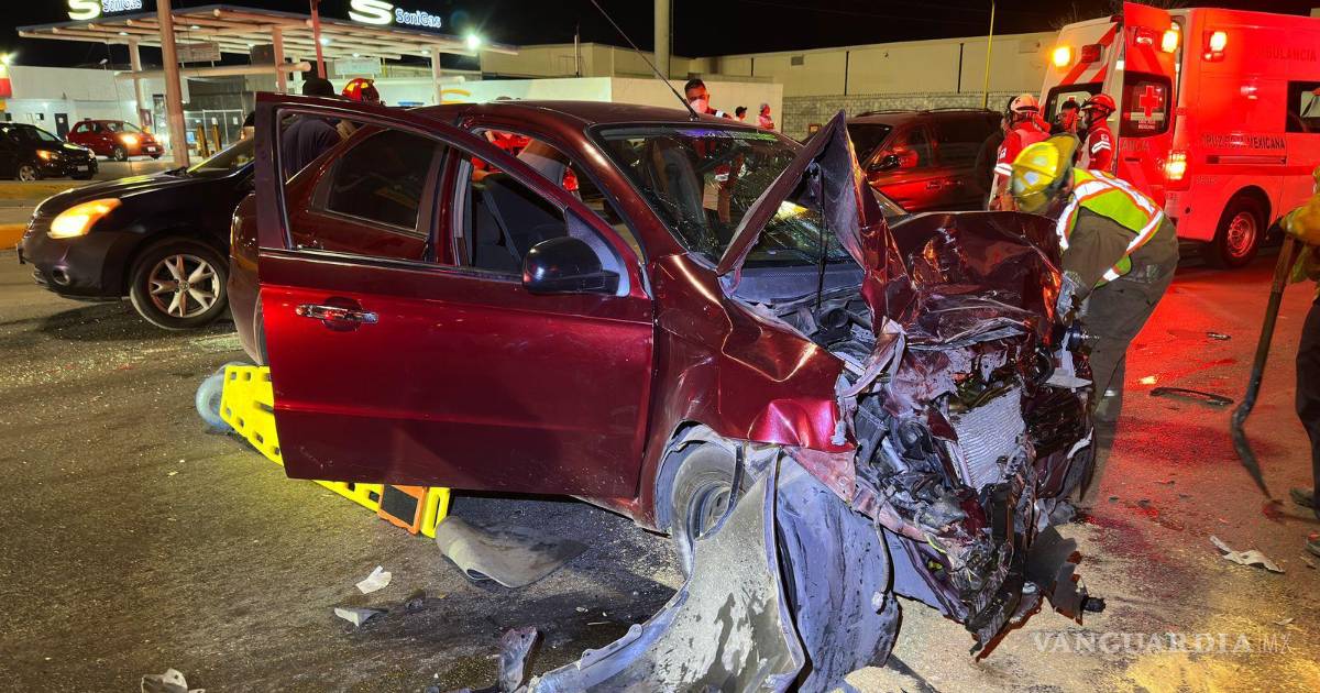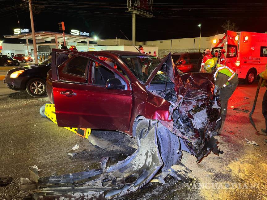 Un aparatoso accidente se registró la madrugada de este sábado en la colonia Herradura, en Saltillo, luego de que un conductor en presunto estado de ebriedad se pasara un semáforo en rojo e impactara una camioneta pick-up, dejando su vehículo destrozado y quedando atrapado en el interior.