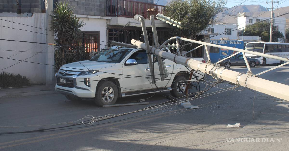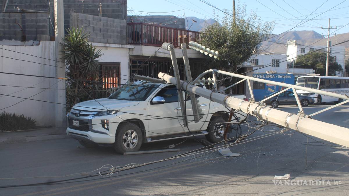 El operador de un tráiler provocó un accidente la tarde de este lunes al engancharse con el cableado aéreo y derribar un poste de concreto que cayó sobre una camioneta en movimiento, en la colonia Valle de las Torres, en Saltillo.