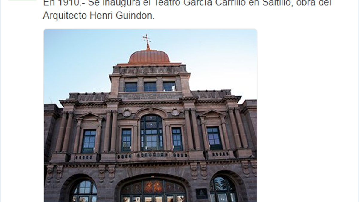 En el mensaje que hasta el cierre de esta edición seguía en sus redes sociales, se puede leer: “Un día como hoy en 1910 se inaugura el Teatro García Carrillo en Saltillo, obra del arquitecto Henri Guindon”.