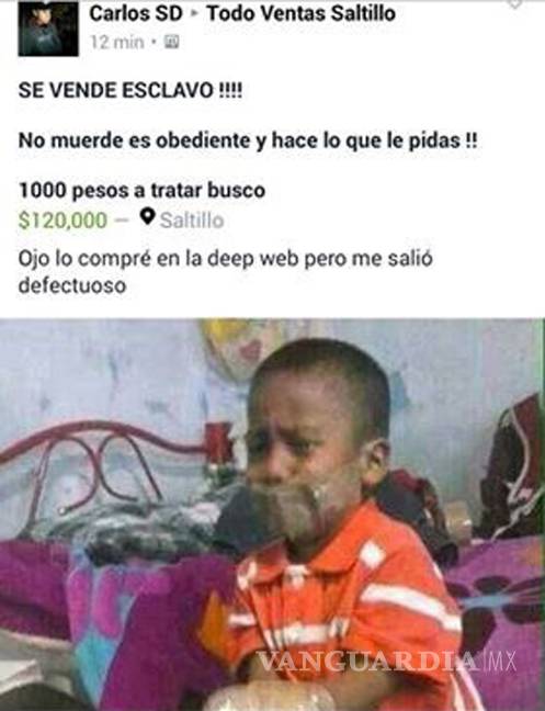 El usuario Carlos SD hizo el posteo en la página de Facebook Todo Venta Saltillo, donde señaló lo siguiente: “Se vende esclavo, No muerde es obediente y hace lo que le pidas, Ojo, lo compré en la Deep web pero me salió defectuoso”, como en los casos que se presentaron hace dos semanas; dicha cuenta fue dada de baja y la publicación desapareció.