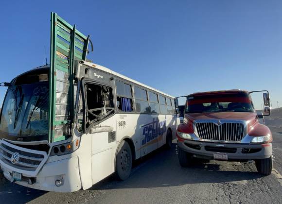 Un aparatoso accidente se registró la mañana de este sábado en la carretera Saltillo- Zacatecas, donde la puerta trasera de un camión de carga terminó incrustada en un autobús de transporte de personal de la empresa Settepi, que trasladaba alrededor de 10 pasajeros.