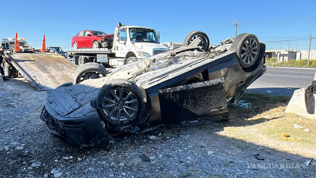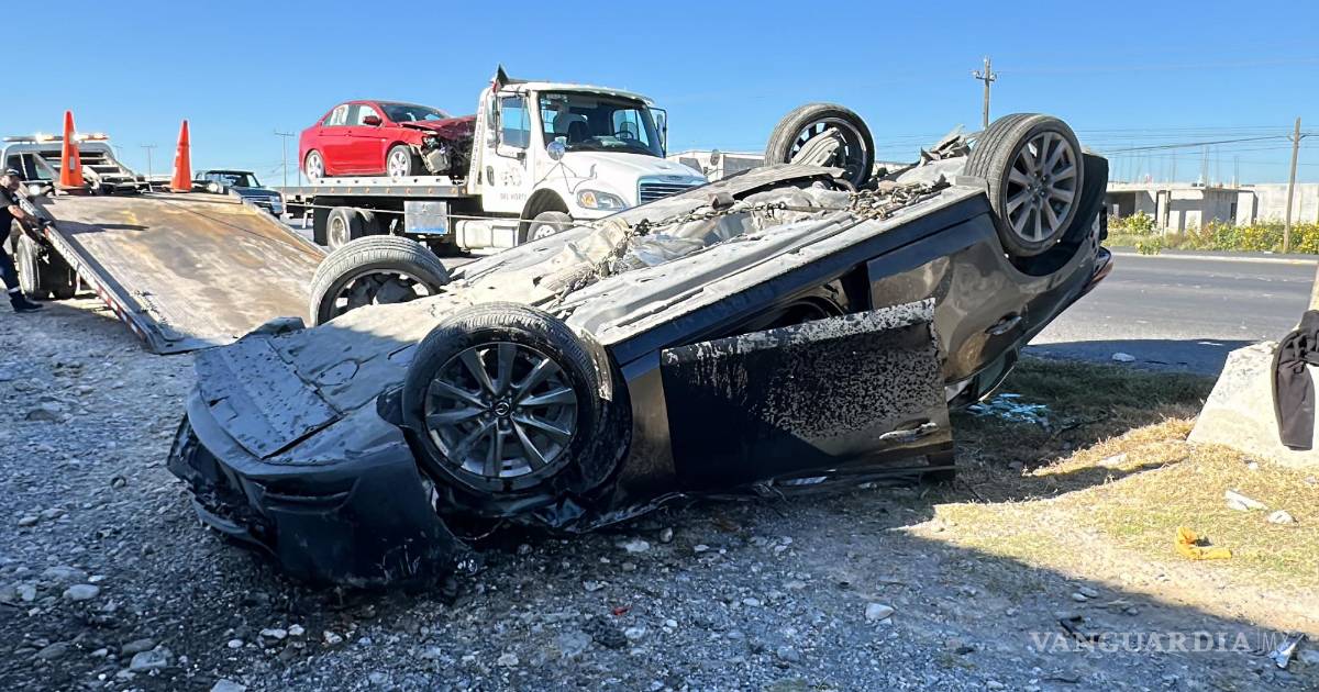 La mañana de este lunes, un accidente vehicular en el kilómetro 1 del libramiento Óscar Flores Tapia en Ramos Arizpe resultó en la volcadura de un automóvil. El incidente ocurrió cuando Ana Patricia “N”, de 36 años, intentó incorporarse al parque industrial Amistad Aeropuerto a bordo de su Mitsubishi Lancer, donde viajaba con un menor de dos años.