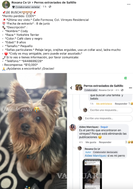 Han pasado casi 11 meses desde la desaparición de Cody, un perro de raza Yorkshire Terrier, y su familia no pierde la esperanza. El 8 de junio de 2024, Cody fue visto por última vez en la colonia Virreyes Residencial, en Saltillo, y desde entonces su dueña, Roxana, ha recurrido a las redes sociales para difundir su búsqueda.