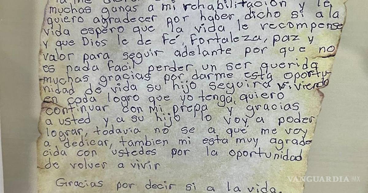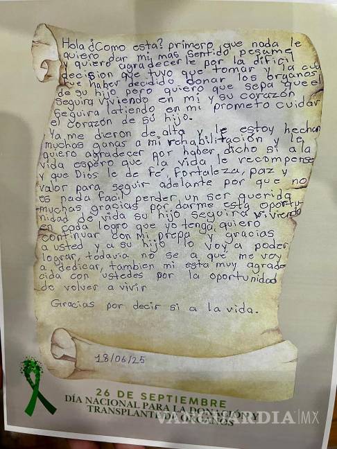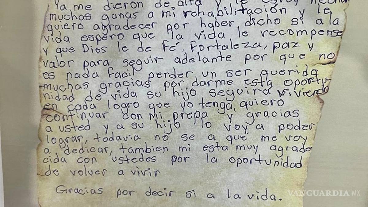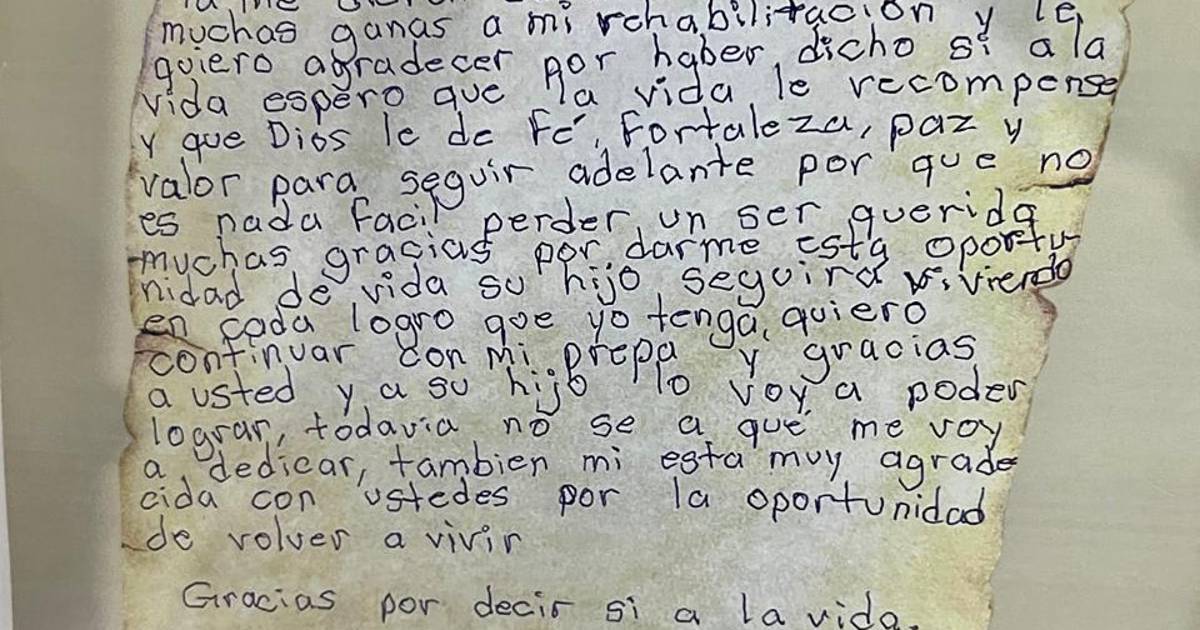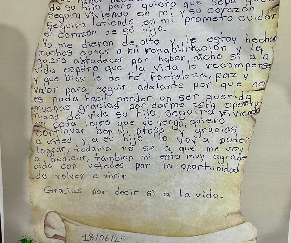 Esta carta expone la magnitud de esta decisión. La joven, quien ya fue dada de alta tras el procedimiento, compartió su profundo agradecimiento a la familia de Mario Daniel por la decisión de donar sus órganos.
