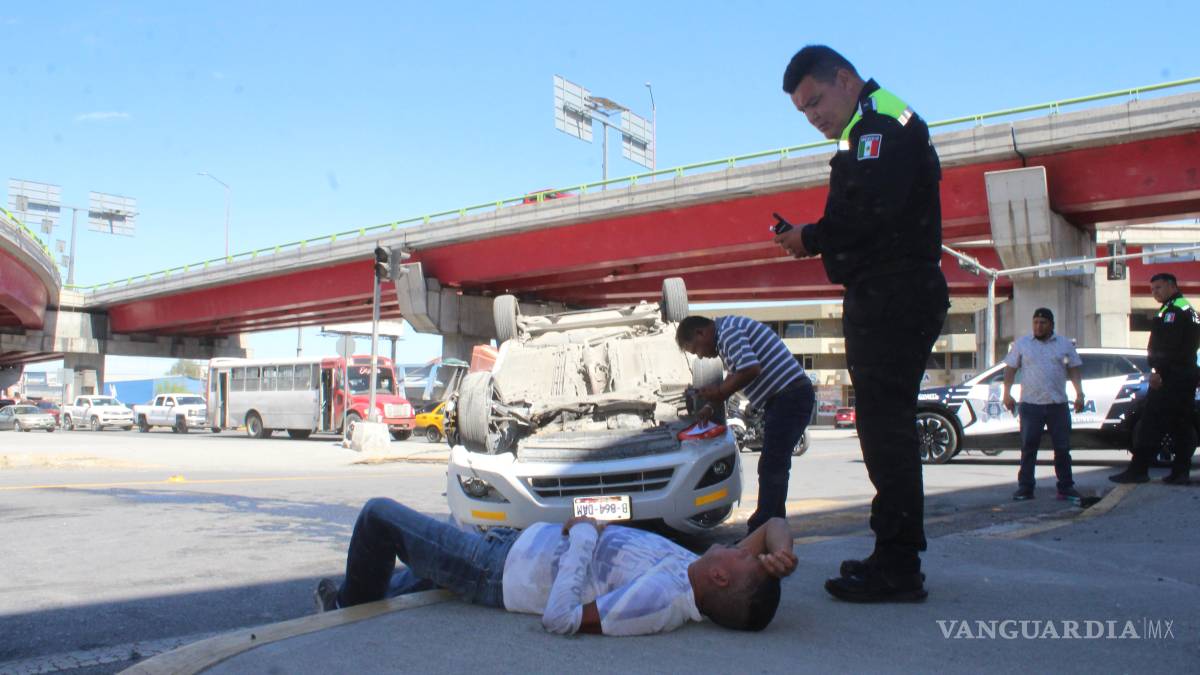 Un aparatoso accidente se registró bajo los puentes del distribuidor vial El Sarape, en Saltillo, donde un taxista volcó tras maniobrar bruscamente para evitar un choque.