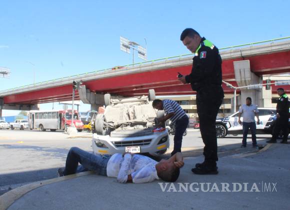 Taxista sufre volcadura bajo el distribuidor vial El Sarape, en Saltillo
