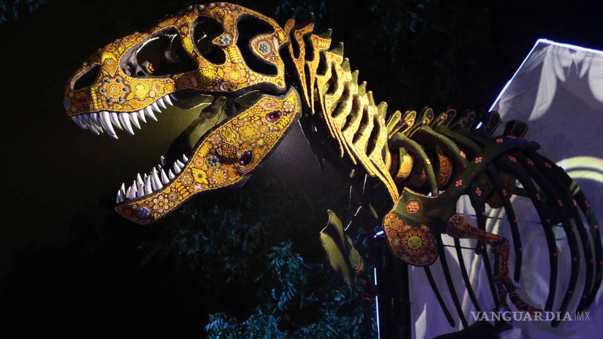La exposición está compuesta por dos piezas paleográficas a escala, un Tiranosaurio, y un Velafrons Coahuilensis, una especie descubierta en esta entidad y con una antigüedad de 72 millones de años, pero que ahora en réplica adornada con el arte de 26 huicholes tiene 15 metros de largo.