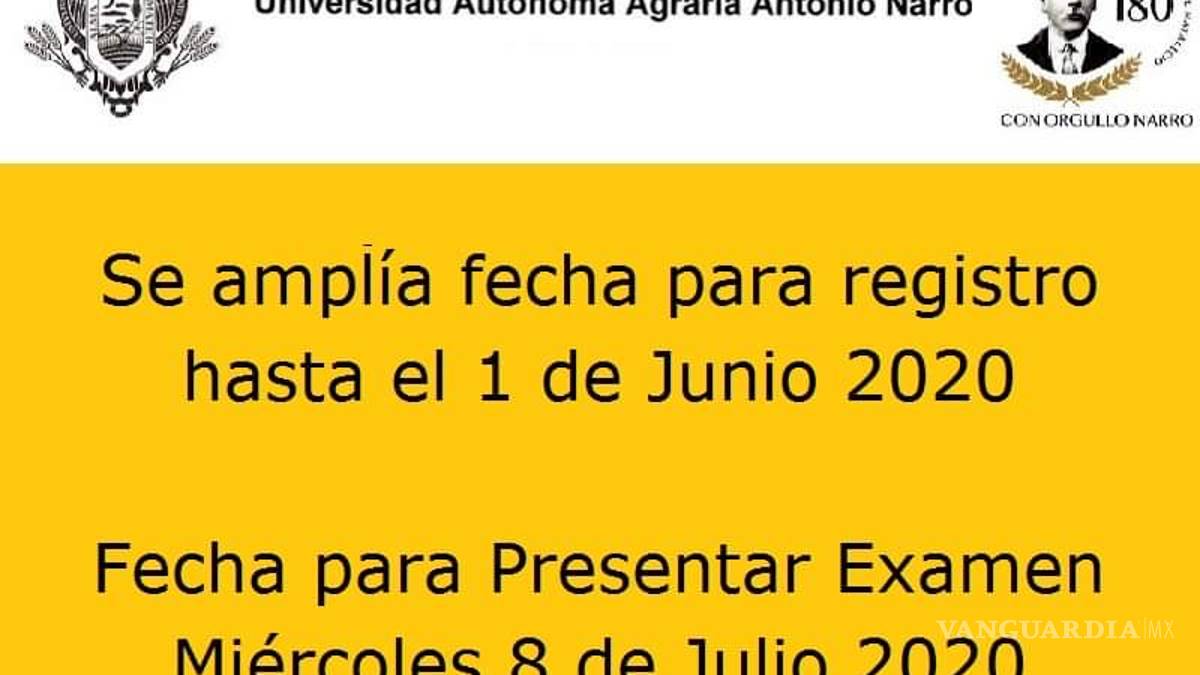 Debido a la contingencia sanitaria nacional por el COVID-19, la Universidad Autónoma Agraria Antonio Narro (UAAAN), modificó la fecha de aplicación del examen prevista para el próximo 10 de junio, así como el periodo de registro para los aspirantes a ingresar el próximo semestre.