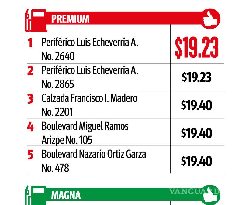 En el caso del combustible Premium, el costo más barato por litro que se registró en el sureste de Coahuila para esta semana es de 19 pesos con 23 centavos en 2 estaciones, mientras que 19.65 pesos es el costo más alto, mismo que se mantiene con relación a la semana pasada.