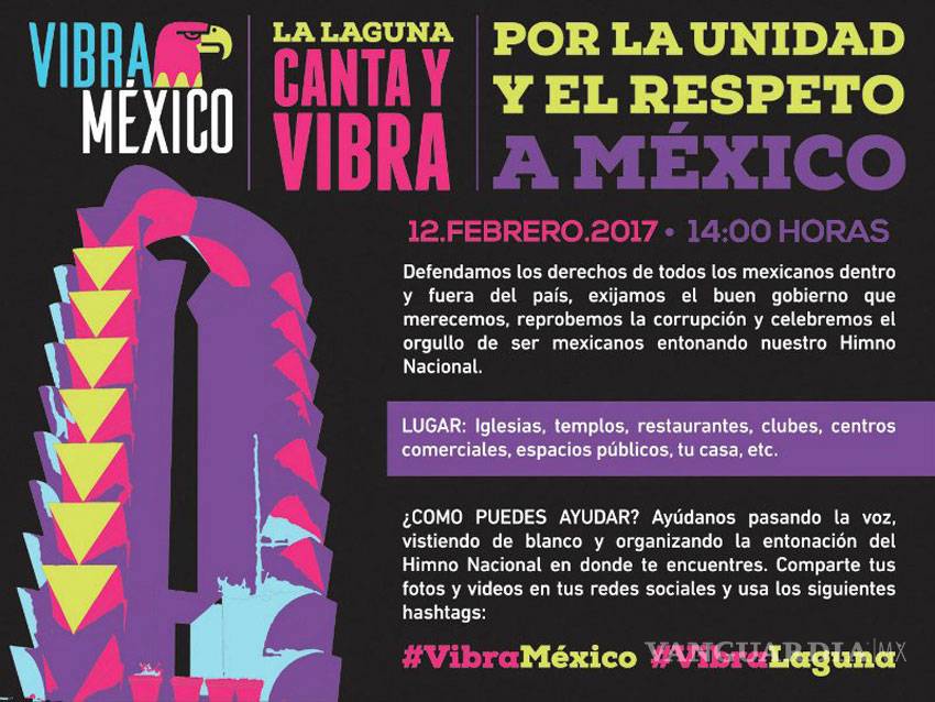 El Movimiento #VibraMéxico en La Laguna que es encabezado en la región por el colectivo Renacer Lagunero, está exhortando a los habitantes de esta región a unirse este próximo domingo a entonar el Himno Nacional a las 2 de la tarde, en cualquier lugar donde se encuentren los habitantes.