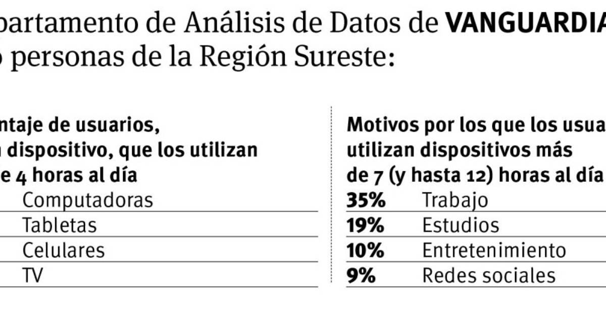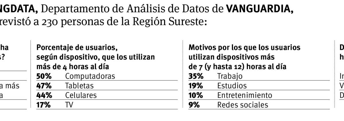 Una encuesta de VANGDATA a 230 personas de la Región Sureste arrojó que en los últimos meses se ha disparado el tiempo que las personas utilizan sus dispositivos electrónicos.