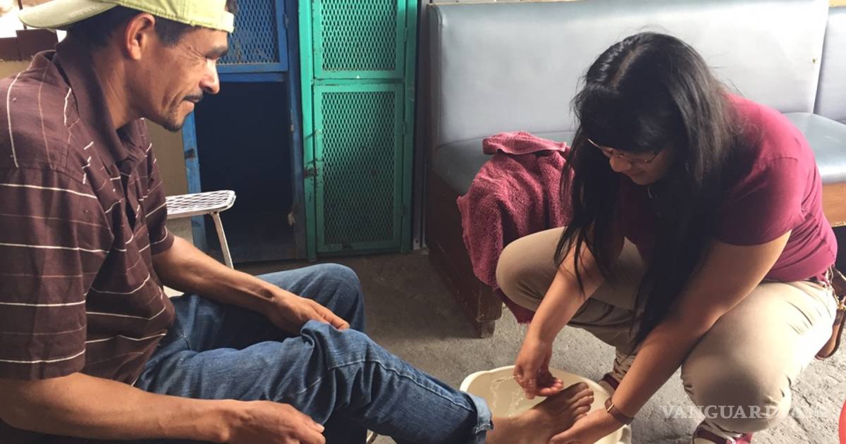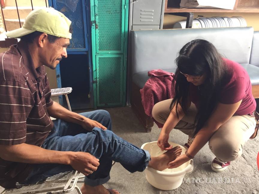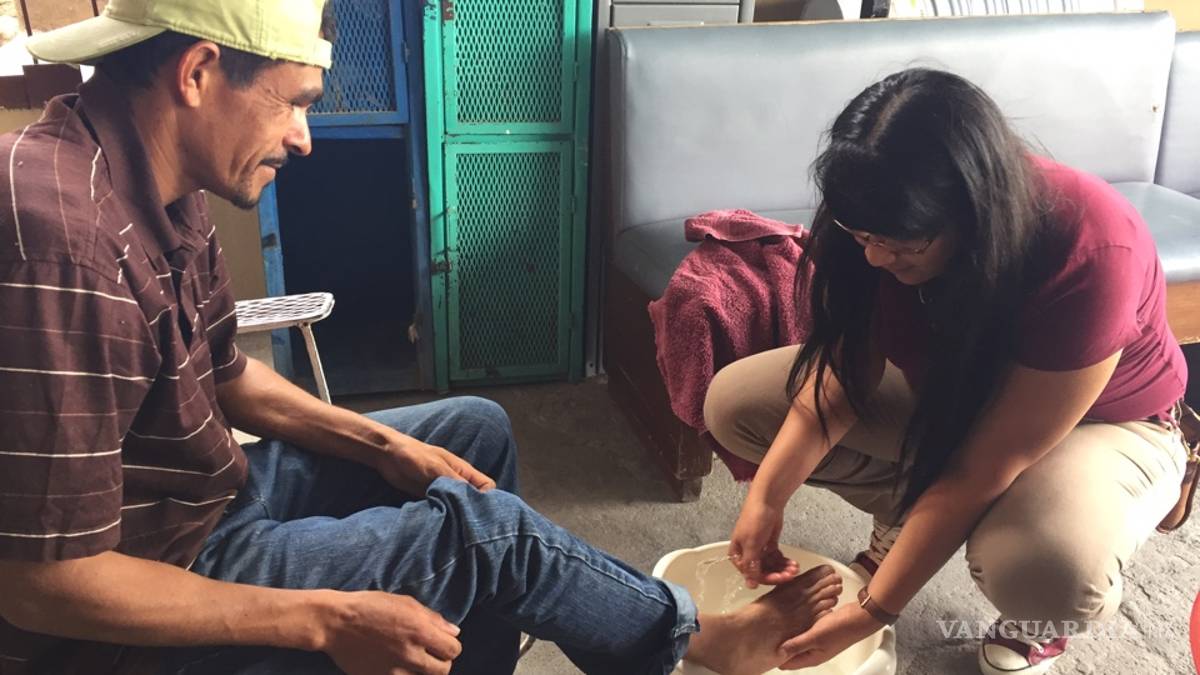 Voluntarios apoyan en lavatorio de pies en la Casa del Migrante de Saltillo