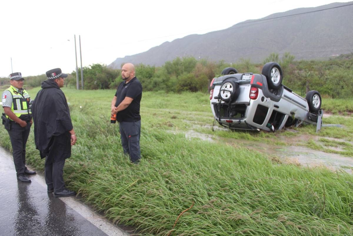 Debido a las condiciones del pavimento mojado por las lluvias, perdió el control del vehículo, salió de la carretera y dio una voltereta, quedando volcado sobre una zona lodosa.