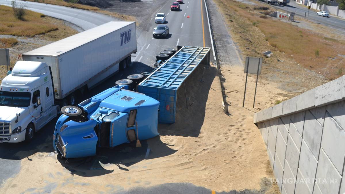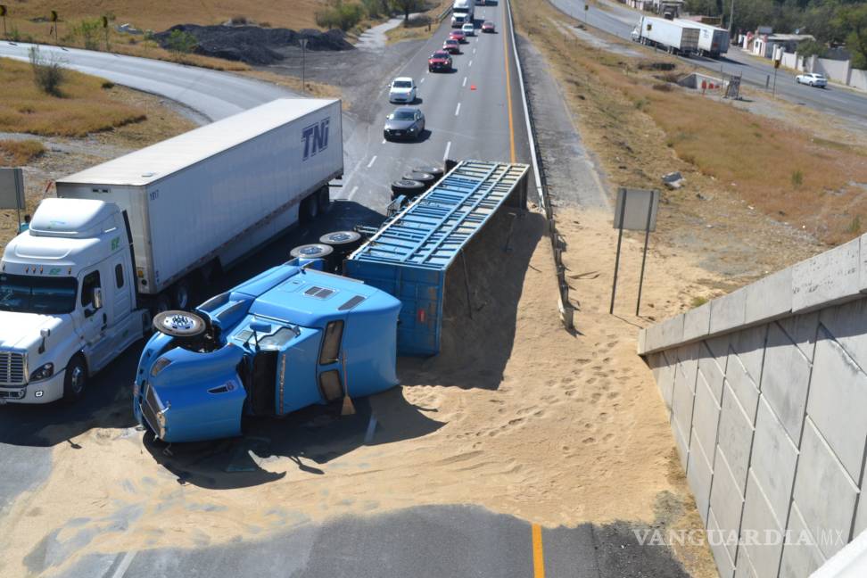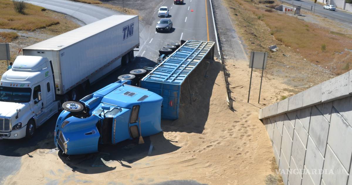 Varias toneladas de sorgo quedaron sobre el pavimento la tarde de ayer al volcarse un camión que procedía de Culiacán con dirección a Monterrey, sin embargo en el Trébol para incorporarse de la autopista de cuota a la carretera libre se presentó el accidente.