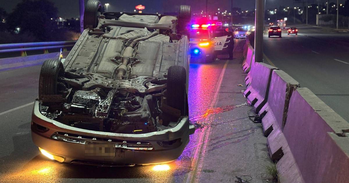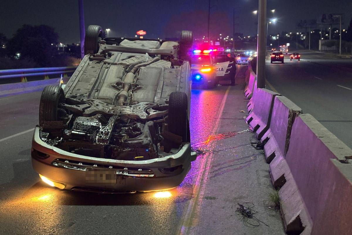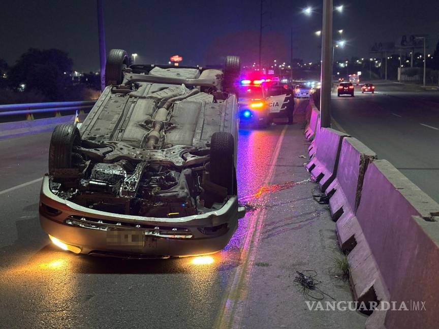 Un conductor presuntamente en estado de ebriedad terminó volcado la madrugada de este sábado en la colonia Lomas de Lourdes, al dur de Saltillo, luego de utilizar la base de un puente vehicular como rampa.