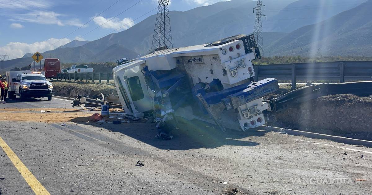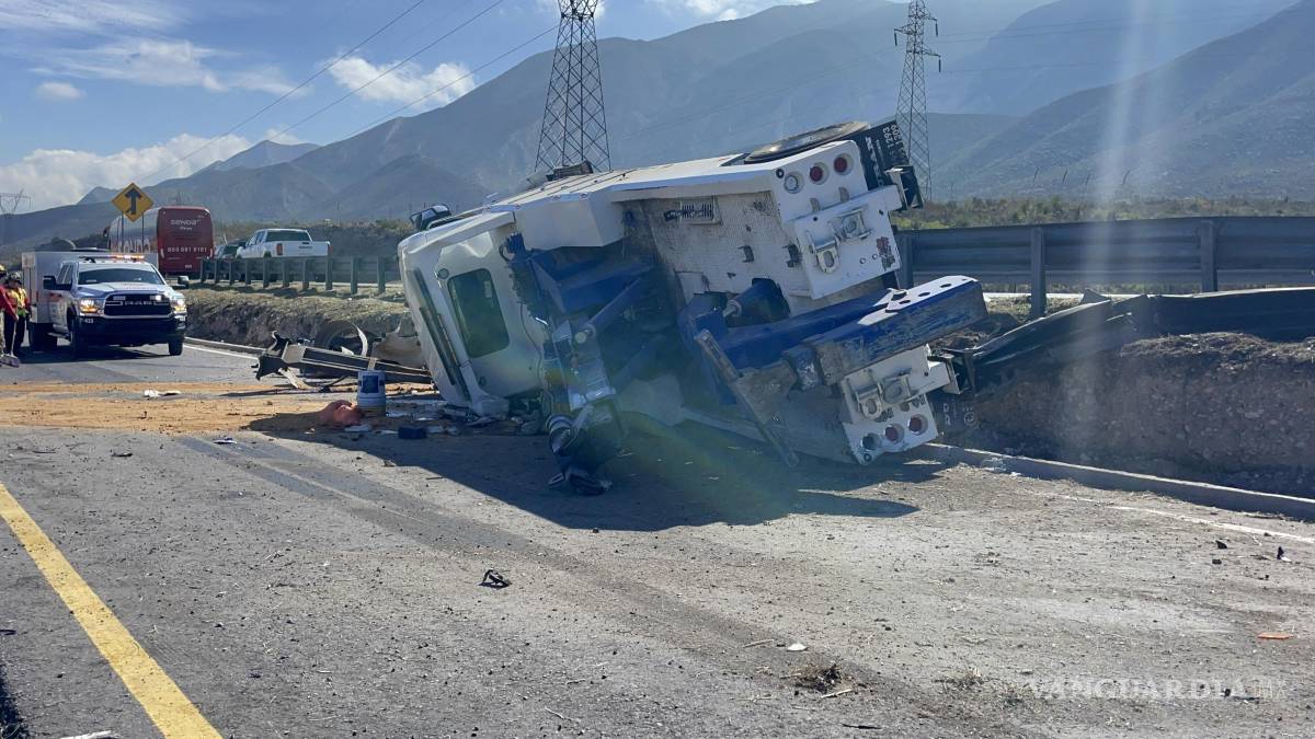 Vuelca grúa tras perder el control en la Saltillo-Monterrey; conductor ileso