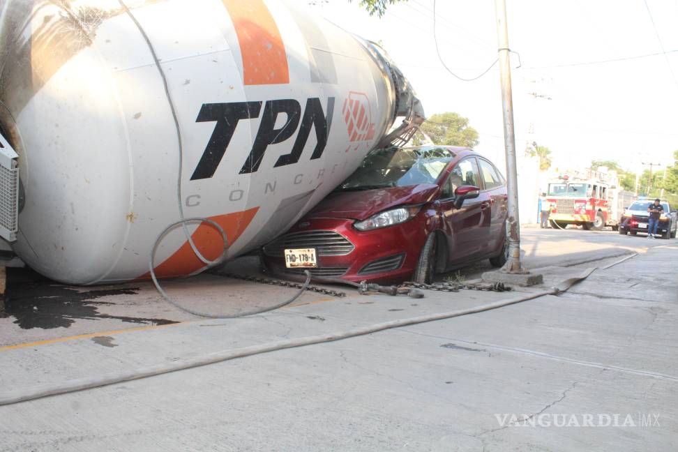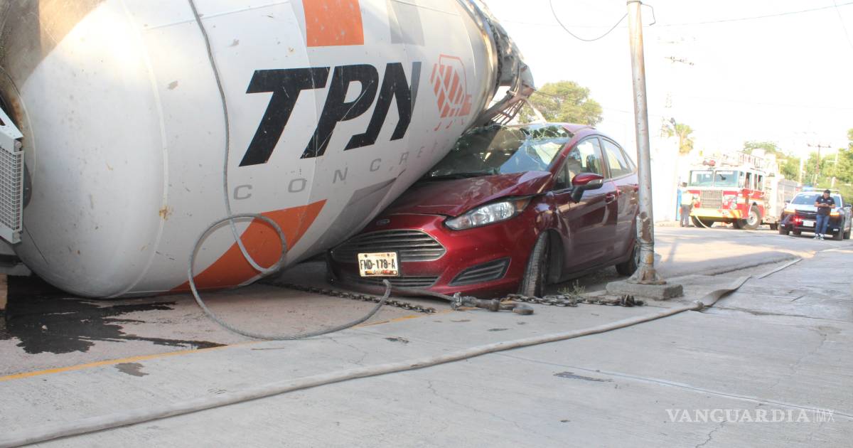 Vuelca revolvedora y aplasta vehículo en Saltillo