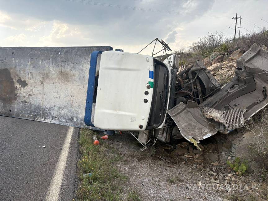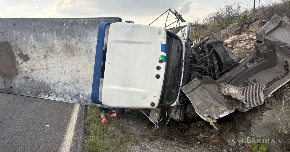 Un tractocamión de plataforma perteneciente a la empresa Grúas San José volcó este martes mientras circulaba de norte a sur en la carretera Saltillo–Monclova, a la altura del kilómetro 22, cerca del ejido San Miguel.