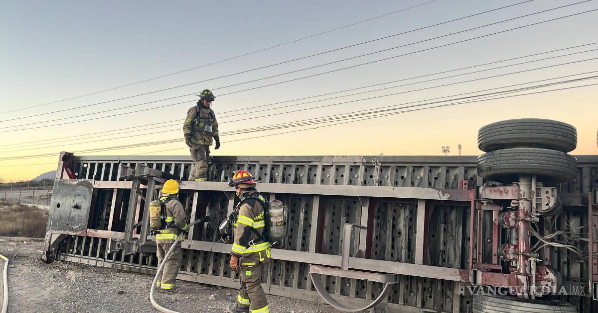 Vuelca tráiler con cilindros de gas y cierran la antigua carretera a Monclova por riesgo de incendio